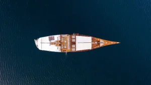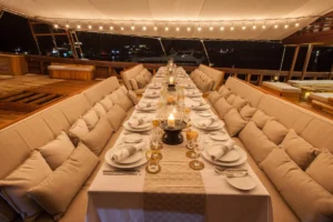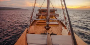 The interior aura of PRANA is a poetic narrative of serenity, simplicity, and elegance. The subtle interplay of soft taupe and cream linens against authentic colonial woods evokes a warm, intimate ambiance, remarkably achieved amidst the vessel’s generous expanse. The design ethos gracefully extends to the outdoor decks, each curated to offer unique experiences. The top-level deck morphs from a peaceful yoga sanctuary by day to a celestial cinema under the stars by night.