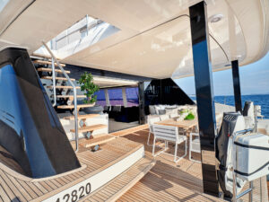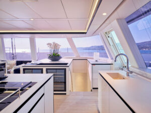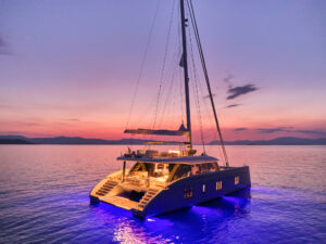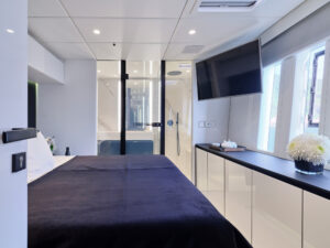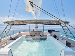 Above & Beyond,” a 24.4m catamaran built by Sunreef Yachts in 2019, offers luxury charters for up to 8 guests in four stylish cabins: a master suite, a VIP, a double, and a twin. Equipped with a crew of five, this yacht ensures a comfortable and seamless experience. The yacht features elegant interiors, a deck jacuzzi, and is fitted with a GRP hull, cruising at 9 knots with a top speed of 22 knots.