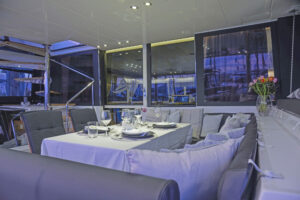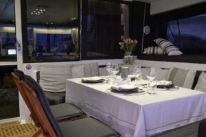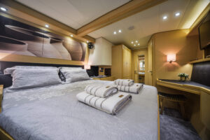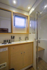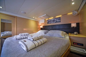 Aura, a 56-foot luxury catamaran, combines modern design with expansive space to deliver comfort and style on the open sea. This vessel accommodates up to 10 guests across five elegantly designed cabins, each featuring an ensuite bathroom. The master suite stands out with its generous space and breathtaking views of the environment. The interior includes a large salon and a fully equipped galley. Outside, Aura boasts a spacious aft deck with cozy seating and a flybridge that offers additional areas for sitting and lounging. The forward cockpit serves as an ideal location for sunbathing or sipping drinks.