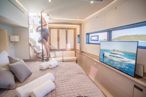 The yacht’s design maximizes space with large deck areas for relaxation and socializing. Each suite comes with private en-suite bathrooms, ensuring comfort and privacy. For entertainment, D2 offers a variety of water toys, a sophisticated audio-video system, and speakers across different zones, including the flybridge.