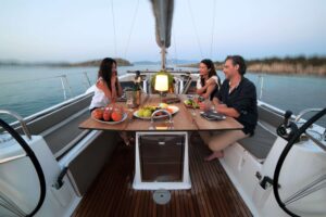 Guests on board DRUNKEN SAILOR can enjoy a range of amenities including air conditioning, a coffee machine, light fishing gear, an indoor audio system, local TV, a swim platform, a water maker, and Wi-Fi. A detailed list of additional amenities and water toys is available in the features and amenities section.