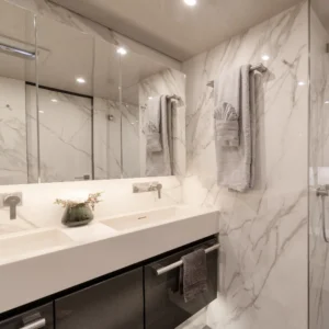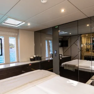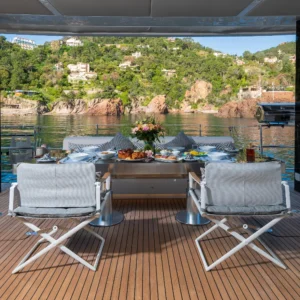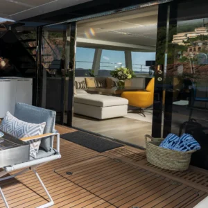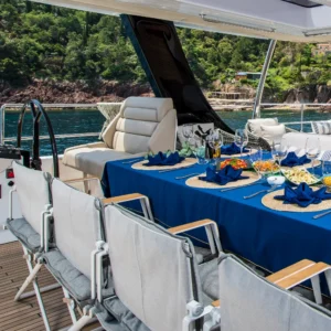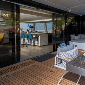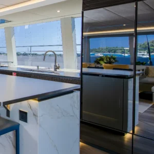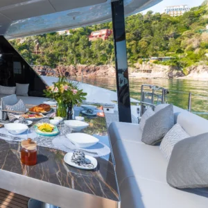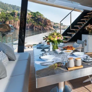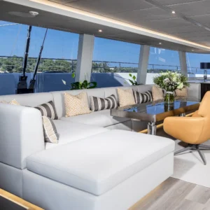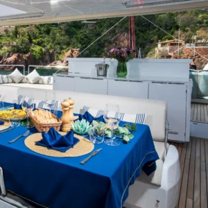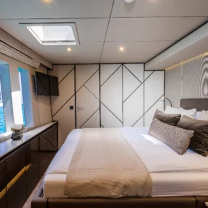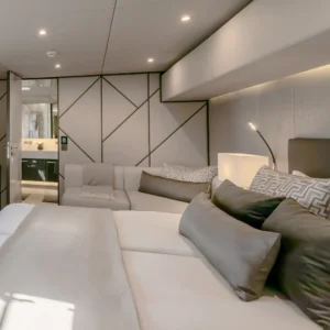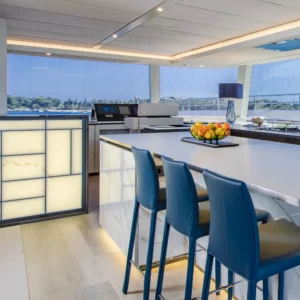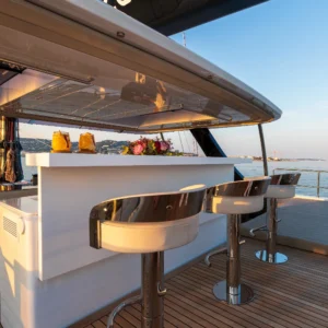 With four expansive cabins, she graciously accommodates up to 8 guests. The master suite is a haven of comfort, boasting a lavish bathroom, a cozy sofa, and a dedicated dressing area. The living space features an interactive galley, allowing guests to savor live culinary performances by the yacht’s exceptional chef. Each cabin is equipped with a TV, ensuring entertainment at every corner. Stay connected with robust Wi-Fi and lose yourself in the rich melodies from the Yamaha Sound system. For added comfort, the yacht is fully air-conditioned.