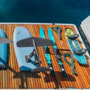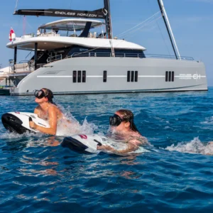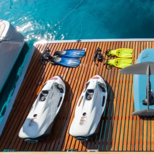 But the luxury doesn’t end indoors. ENDLESS HORIZON comes with a plethora of aquatic toys and gear. Whether you’re diving deep with personalized dive equipment, zipping through the waters on seabobs & fliteboards, or indulging in wakeboarding, inflatables, paddleboarding, and snorkeling, there’s never a dull moment. With her remarkable stability, she smoothly sails at 8 knots and can reach up to 11 knots, letting you glide effortlessly through pristine waters.