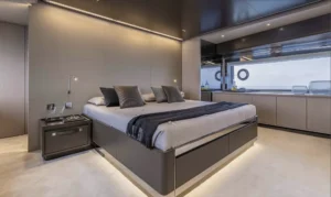 Your days on the yacht “G” promise an array of delightful outdoor living spaces. Revel in the Mediterranean sun on the expansive sun deck, equipped with plush sun pads and an exterior bar to keep the beverages flowing. The swimming platform further beckons for a refreshing dip into crystal clear waters.