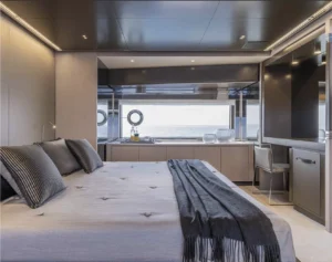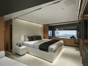Engineered for exemplary performance on the water, “G” boasts a robust GRP hull and superstructure. Its twin MTU engines propel this majestic vessel at a cruising speed of 20 knots, peaking at a thrilling 30 knots, ensuring you voyage through the Mediterranean with grace and agility. With a substantial fuel capacity of 8,700 liters, relish in an extended range of up to 320 nautical miles at 22 knots, broadening the horizon of your seafaring adventures.