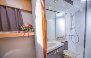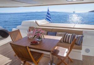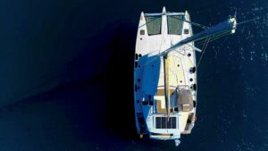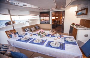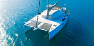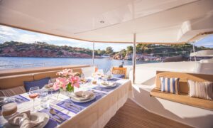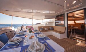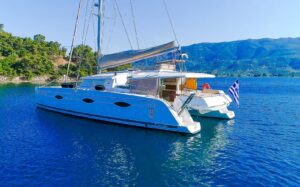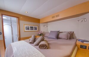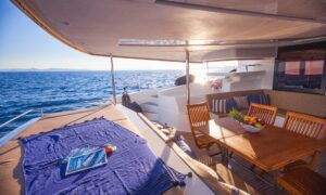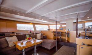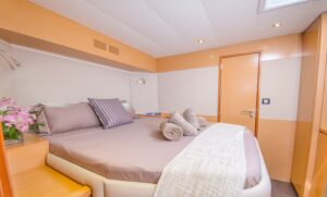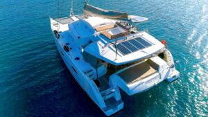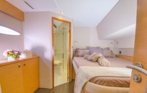 The HIGH FIVE sailing yacht is a 17.92m (58′ 10″) Fountaine Pajot catamaran from France, built in 2013 and refitted in 2017. Designed to comfortably accommodate up to 10 guests across five elegant suites, it features a dedicated crew of three. The aft deck is tailored for relaxation and dining, while the foredeck offers prime sunbathing spots and potential dolphin sightings. The Flybridge provides panoramic views and a sociable atmosphere. Inside, the main salon includes a lounge and dining area, an open galley, and a navigation desk. Each suite boasts contemporary décor, ample storage, and ensuite bathrooms with a full range of amenities, ensuring luxury and privacy.