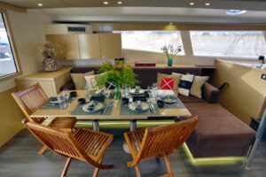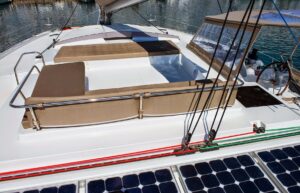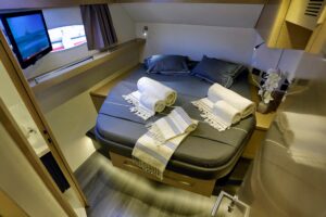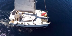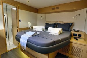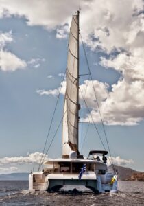 HIGH JINKS is a luxurious 58-foot Fountaine Pajot catamaran, ideal for exploring the Greek Islands with a draft of only 7 feet, allowing access to shallow waters. It accommodates up to eight guests in four stylish cabins, including a king-size suite and three queen-size cabins, each with private ensuites and entertainment systems.