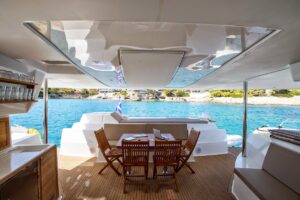 The yacht features multiple outdoor lounging areas, including an aft deck with dining facilities, a bar, and a day bed, plus a foredeck with sunpads and a trampoline. The flybridge offers a perfect spot for enjoying sunsets with a cocktail.