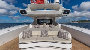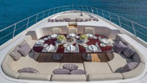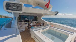 The 39.65-meter ‘Jomar’ open yacht, crafted by Italian shipyard Overmarine, is available for charter, accommodating up to 10 guests in five cabins. This luxury yacht is perfect for relaxation and socializing, featuring lavish sunpads, a swim platform for water activities, and a deck jacuzzi. Jomar provides guest accommodations in a master suite, a VIP cabin, two double cabins, and a twin cabin. It includes state-of-the-art amenities like a gym, Wi-Fi, and air conditioning, ensuring comfort and connectivity.