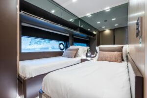 Kar is a 26.82m (88’) Riva 88 Folgore, combining sleek Italian design by Officina Italiana Design with exceptional performance. Fresh from a 2024 refit, she offers full-beam master suite comfort, accommodation for 8 guests in 4 stylish cabins, and service from up to 4 professional crew. Powered by twin MTU engines, she cruises at 20 knots and reaches an exhilarating 36 knots, with a range of 350 nm.