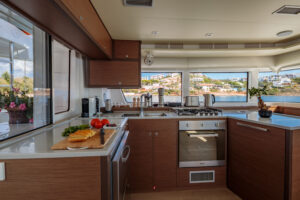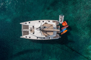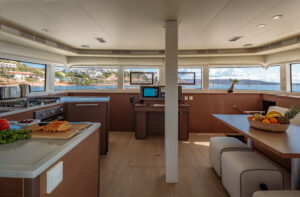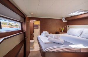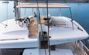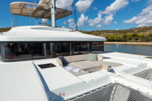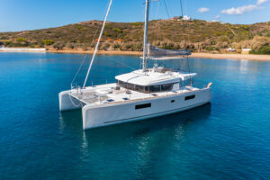 MADININA, a Lagoon 52F catamaran, is a luxurious 52-foot sailing vessel designed for cruising the Greek Islands with up to eight guests. Its 28-foot beam ensures ample space, merging outdoor and indoor areas seamlessly, featuring a spacious aft deck, a flybridge with seating, and twin trampolines on the foredeck.