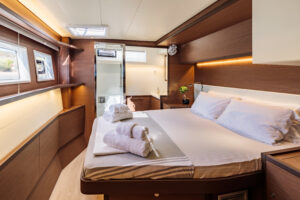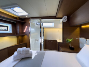 The cockpit is set for alfresco dining and relaxation, while the interior hosts a tranquil saloon with dining and lounge areas and a fully equipped galley. The yacht features four large cabins, each with private ensuites and large windows for natural light and views.