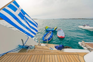 Available water toys include a motorized tender, water skis, fishing and snorkeling gear, a tube, SUP, kayak, sea scooters, an inflatable platform, and more.