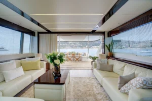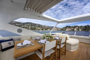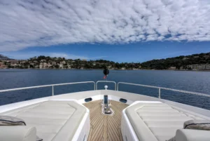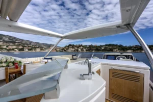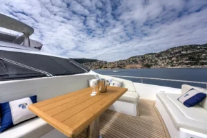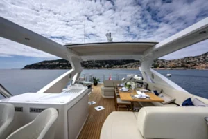 Oreggia Yacht boasts a robust GRP hull and superstructure, propelled by twin MAN engines. With a cruising speed of 25 knots and the ability to sprint up to 32 knots, your voyage is as swift as it is serene. The yacht’s shallow draft of 1.7m/5’7″ allows for intimate anchoring near secluded coves and pristine bays, unlocking a world of exploration and overnight serenity.