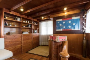 At the outbreak of World War II, The Royal Navy commandeered the yacht, then named Janetha IV, and put her to use as a coastal patroller by the name of HMS Corax. To strenghten her, the 71 ribs were re-inforced on either side. During the war, the yacht’s dining room was used as the principal officer’s mess and the main leisure pastime was to play darts. To this day, the original Honduras mahogany panels still show the scars of where the darts missed the desired target, adding to OVER THE RAINBOW’s history and character.