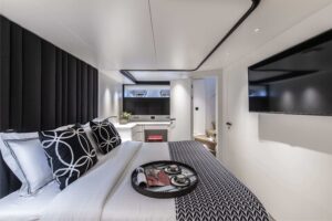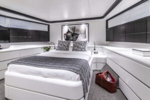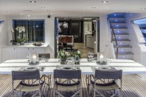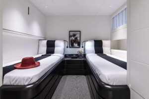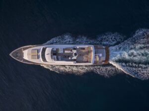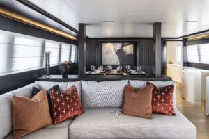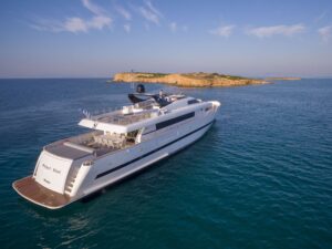 Project Steel is equipped with a gym, a deck jacuzzi, and a variety of water toys including Jet Skis, WaveRunners, and kayaks, making it ideal for both relaxation and adventure. Powered by twin Caterpillar engines, it cruises smoothly at 11 knots and ensures comfort with its advanced stabilization system.