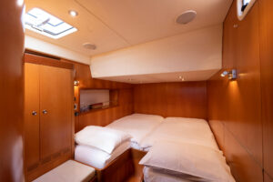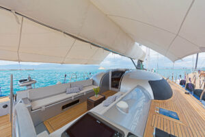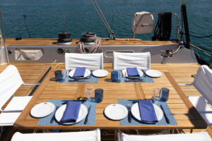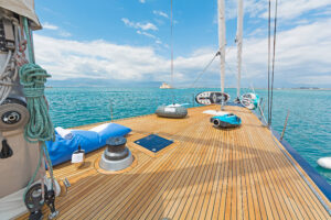 Meliti is designed for both comfort and connectivity, featuring onboard Wi-Fi and air conditioning. She cruises comfortably at 9 knots and includes a range of water toys like towable toys, fishing and scuba gear, paddleboards, and snorkeling equipment, all complemented by a 3.3m Novurania Tender for easy excursions.