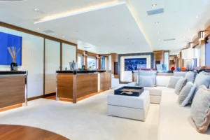Unique Attributes: One of the yacht’s standout features is its hybrid propulsion system, a collaboration between Siemens and ISA Yachts. This allows “Silver Wind” to reach a max speed of 32 knots and a cruising speed of 26 knots using traditional propulsion. At a low speed of 8 knots, the yacht consumes only 90 l/h of fuel, offering a range of 2600 nm.