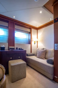 Sirocco’s interior sleeps twelve. The Master Suite is situated on the upper deck and extends the entire beam of the yacht. It includes a spacious party area, office and sumptuous bathroom. This superyacht also has a VIP stateroom, three double cabins and one twin cabin. Areas are air-conditioned and are all fitted with iPad controlled in-cabin entertainment.