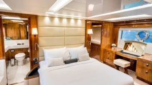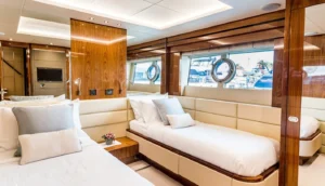 Providing a plush abode on the waves, the Stardust of Mary accommodates up to 8 guests in four sumptuously designed cabins. The guest quarters comprise a lavish master suite, a VIP cabin, and two versatile cabins configurable as twins or doubles, ensuring a tailored resting sanctuary for every occupant. The yacht also provisions for up to 4 adept crew members, ensuring a seamless and relaxed luxury yacht charter experience.