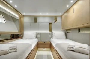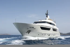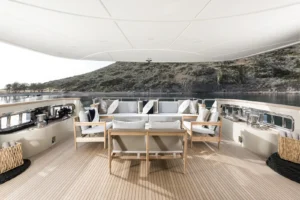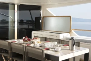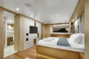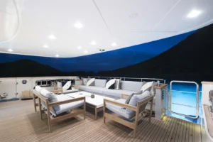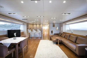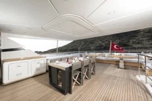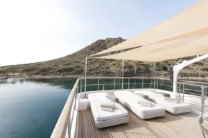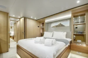 12 guests can comfortably be accommodated in 5 luxurious en-suite staterooms, with a full-beam master on the main deck (with an office), 2 VIP double staterooms and 2 x twin staterooms, each with an additional pullman berth. For the more active guests, the yacht carries a large selection of water sports toys, including a jet-ski and Seabobs and there is a modern AV system onboard for those that want to dance to their favourite music, or take a break, relax and watch a movie. She features an extensive sundeck with a large jacuzzi and bar, the perfect place to relax and soak up the sun or enjoy sundowners after a day’s water sports.
